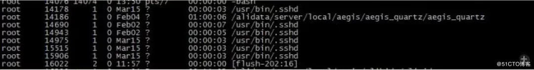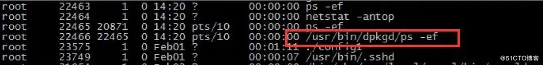 下面继续查看系统进程信息,看看有无其它异常,通过ps命令又发现了新的线索,如下图: