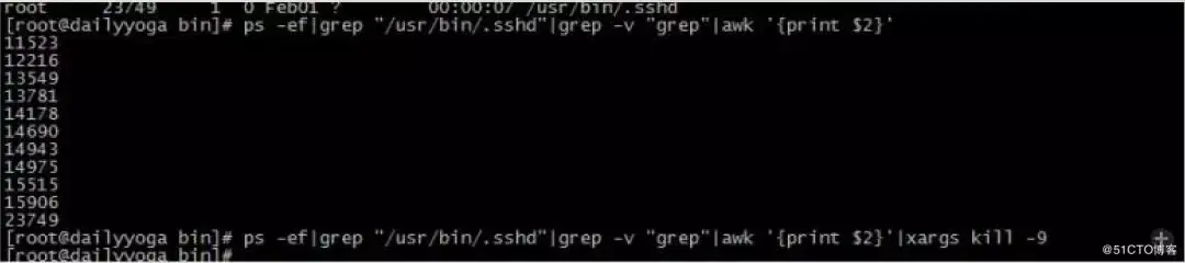 第一步,先删除/usr/bin/.sshd文件,然后关闭此文件对应的进程,看下面的图:
