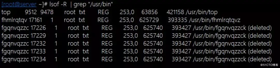 刚刚删除了/usr/bin/apgffcztwi文件,但是又自动生成了新的文件,/usr/bin/fhmlrqtqvz,并且还有一个文件/usr/bin/fgqnvqzzck已经被删除了,但是进程仍然存在,那个deleted就是文件的状态。而且新生成的文件,仍然是10个字符。