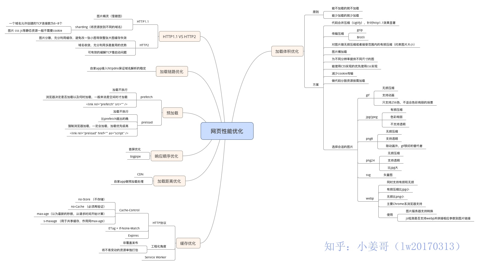 - 选择合适的图片,这个请看脑暴图。webp作为新格式在各方面都有优势,但存在浏览器兼容问题。在图片服务器支持转格式的情况下可以在前端用js判断是否支持webp并将相应参数拼接到图片url上,实现同一图片url根据前端需求加载不同格式。