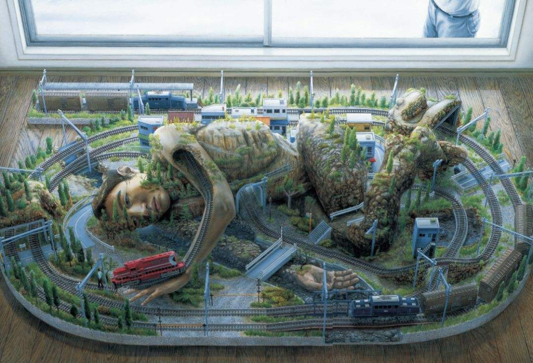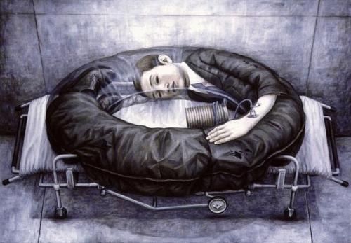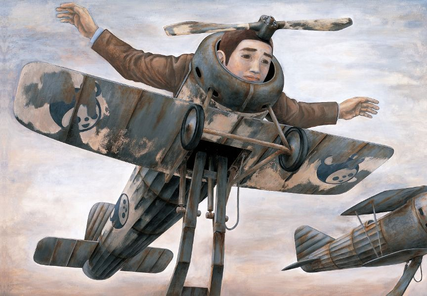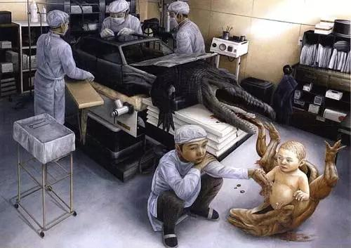 不论多荒诞的超现实世界,在他笔下都是“正常”的,人体器官可以解构为浴缸、洗手盆、轮胎,一个平面同时存在多维空间,人是无情感的工业机器……