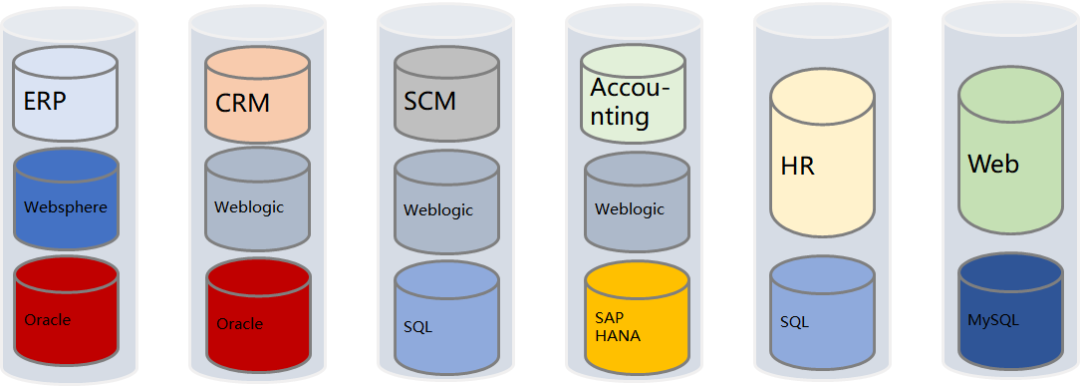 传统架构数据库层,由于外包公司独立开发,或者不同开发部门独立开发,不同业务使用不同的数据库,有用Oracle的,有用SQL Server的,有用Mysql的,有用MongoDB的,各不相同。