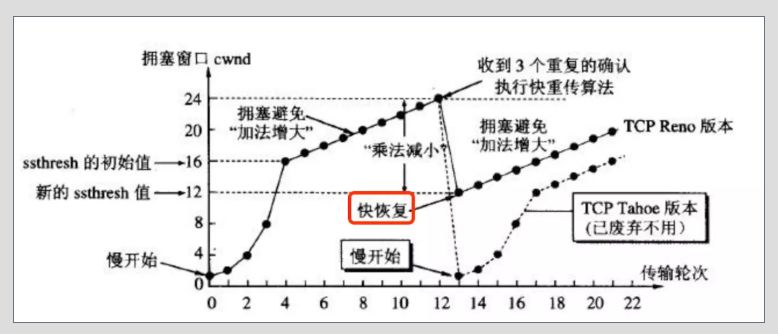 - 快恢复:上面的拥塞控制会在网络拥塞时将拥塞窗口降为 1,重新慢开始,这样存在的一个问题就是网络无法很快恢复到正常状态。快恢复就是来优化这个问题的,使用快恢复,则出现拥塞时,拥塞窗口只会降低到新的慢开始门阀值(即 12),而不会降为 1,然后直接开始进入拥塞避免加法增长,如下图所示:
