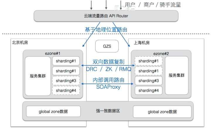 - 可用性优先:当发生故障切换机房时,优先保证系统可用,首先让用户可以下单吃饭,容忍有限时间段内的数据不一致,再事后修复。每个 ezone 都会有全量的业务数据,当一个 ezone 失效后,其他的 ezone 可以接管用户。用户在一个ezone的下单数据,会实时的复制到其他ezone。