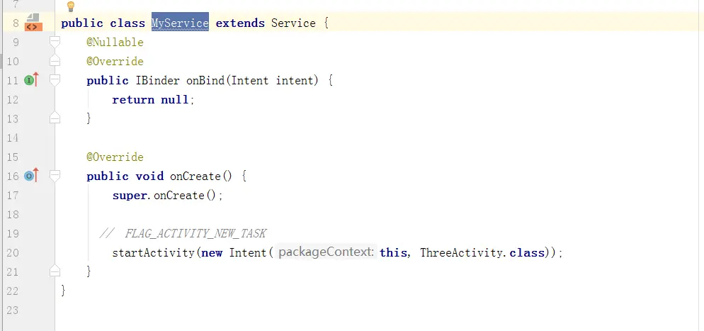 相信大家已经发现问题了,就是在MyService中的 startActivity(new Intent(this, ThreeActivity.class)); 会报错。但是真的会报错吗?请看下面的效果