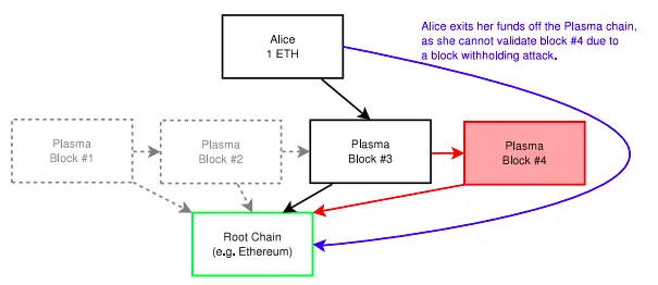 在这种情况下,Alice的解决方案是把她的资金退回到主链上,并离开这个子链。本质上,其实是Alice向根合同提交了“证明资金”。在任何人都能向她的证明发出挑战的延迟期后(例如,证明她在之后一个合法的区块里花掉了这些资金),Alice的资金就回到了以太坊主链上。