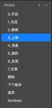 导出的界面图片命名,实际上就是画布的命名,以 Sketch 为例,设计还未导出的阶段就要做出整理。Sketch 中有个关键功能是左上角的 Page 列表,我们可以通过创建不同的 Page 将整个 APP 的页面进行分类。例如下面的案例:
