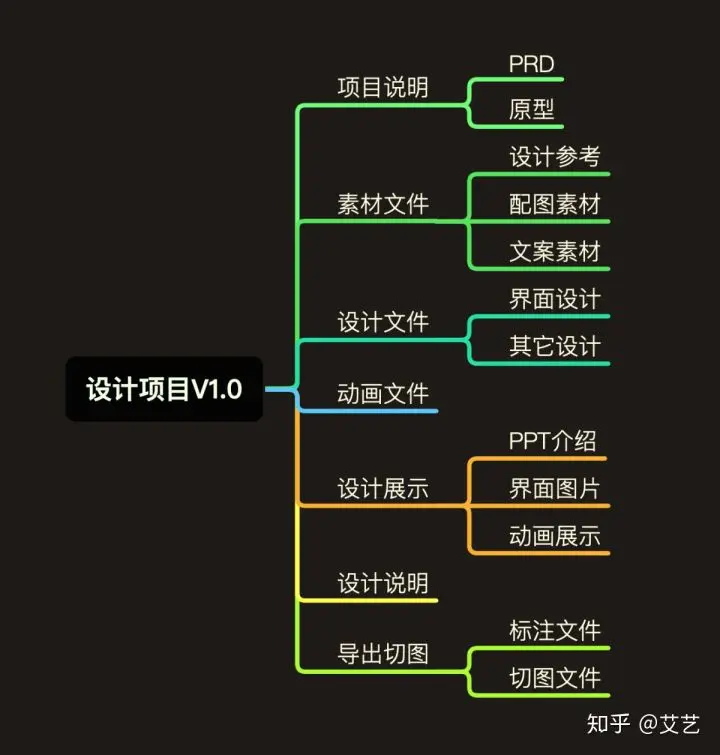 例如,在我过去的某个项目中,第一个版本文件包含的分类有 PRD文档、Sketch原型文件、Sketch设计文件、其它设计文件、动画源文件、参考图片、应用素材、导出展示图、导出交互动画、设计说明、切图等等。