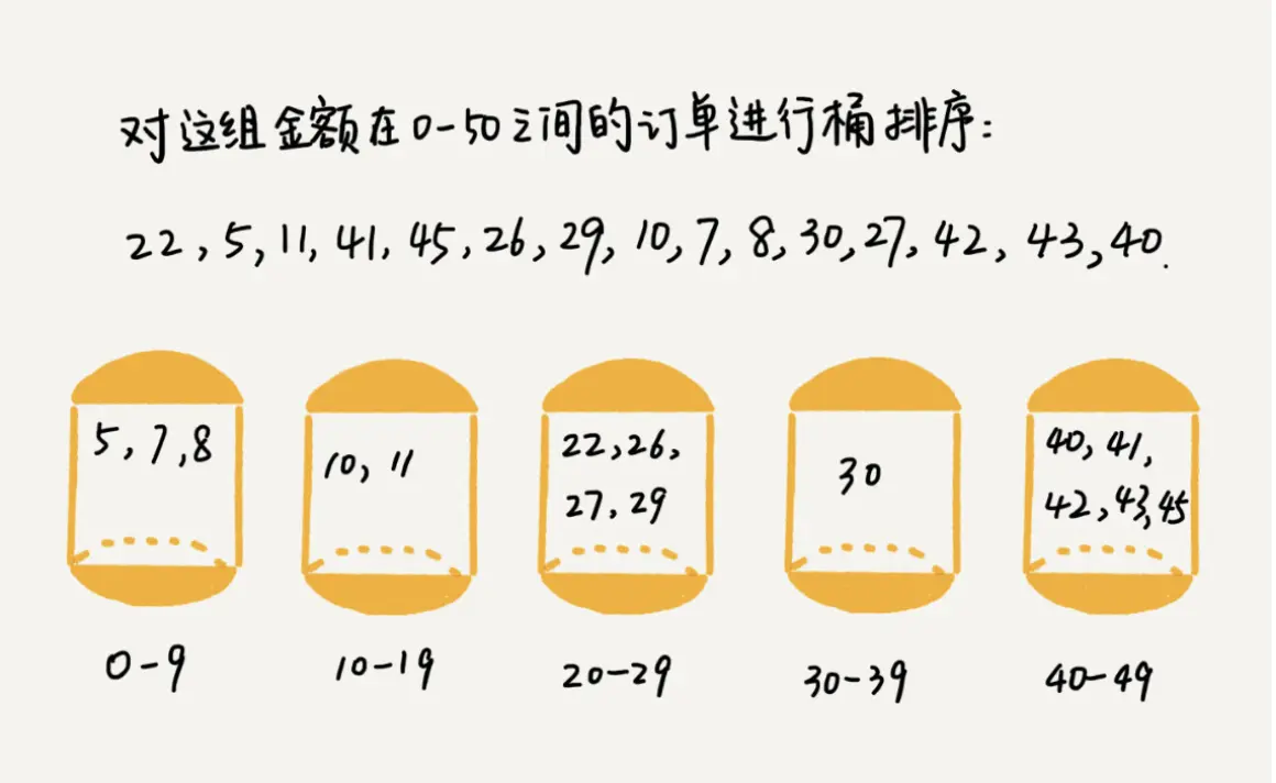 - 如果要排序的数据有n个,把n个数据均匀分到m个桶内,每个桶内有k=n/m个元素。