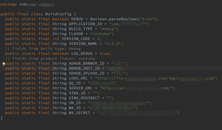 - 可在build.gradle中配置动态配置java代码调用的常量数据(如:通过该方式我们可根据不同渠道动态配置第三方appid,或其他需要根据渠道而改变的数据)