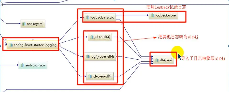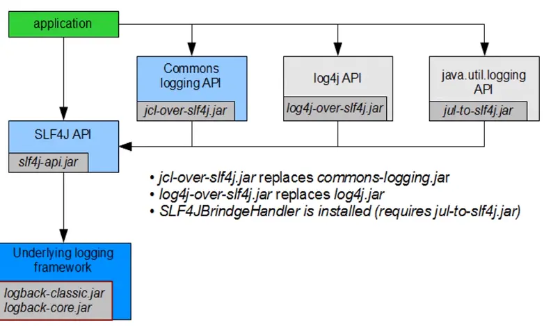 底层通过偷梁换柱的方法,用jcl、jul、log4j中间转换包进行转化