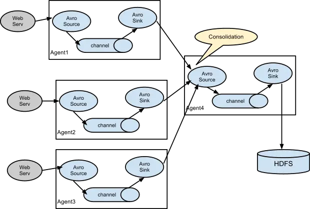 当需要从众多主机上收集日志信息时,我们可以在每台主机上部署 agent,这些主机的 slink 均连接到最终日志落地主机的 source 上。落地主机将所有数据进行组合,落地到 HDFS 上。