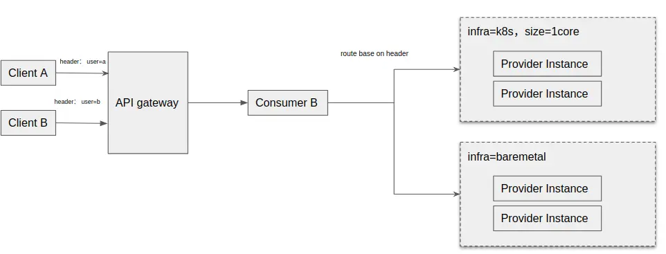 请求通过API gateway(如果由go chassis开发gw,则ConsumerB可以省略) 进入到唯一的入口ConsumerB, ConsumerB根据请求的特征,也就是header来决定该路由到哪个微服务中