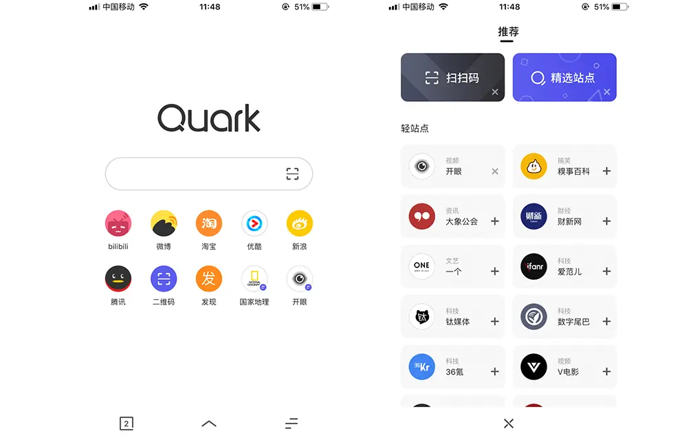 移动端浏览器方面,我现在用的是夸克浏览器,除去简洁好用外,还有许多“插件”也就是H5页面供我选择。
