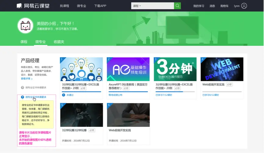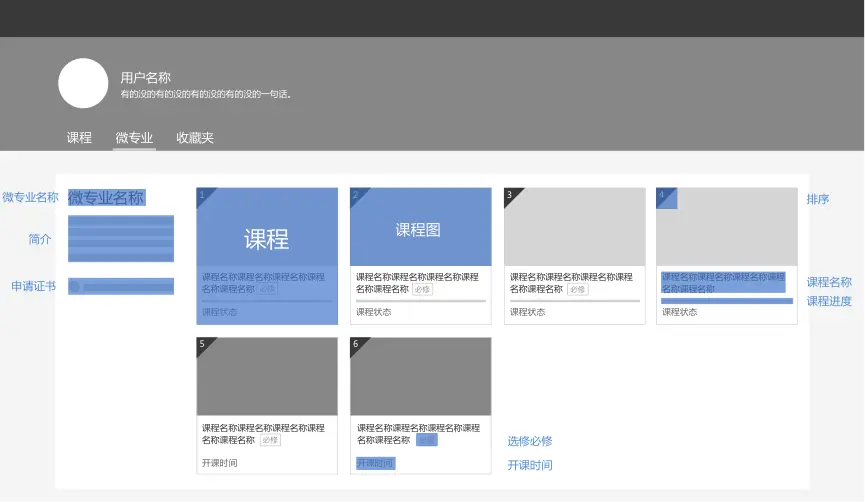 以下分享一个我在设计云课堂我的学习微专业模块视觉样式的一些心路历程吧~下图是我的学习微专业模块改版的交互稿: