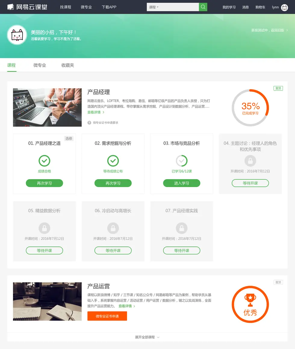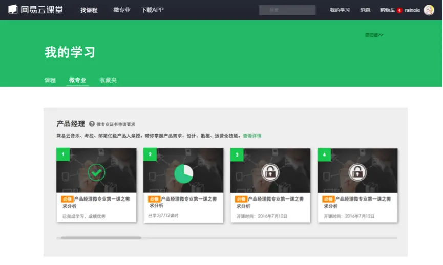 我重新审视了最初的目标,“微专业作为成体系的课程组合,在添加后被分散成单课后加入到“我的课程”中,使这些课程之间的联系丧失了。因此希望微专业可以作为一个整体被加入到“我的学习”中,保留组合课程所有的逻辑联系,同时也减少“我的学习”中的无用信息,减少用户的筛选成本。“策划反复强调了” 为了促进学习,要有升级打怪一样的体验。“