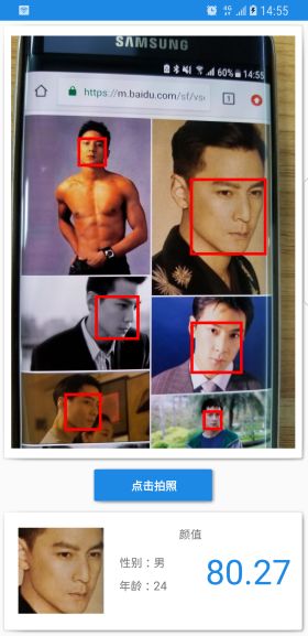 主要的功能就是拍照,然后将照片传至 Face++ 服务器,进行人脸识别,获取返回的信息,对信息进行处理。将人脸在照片上标出,并将信息展示出来。