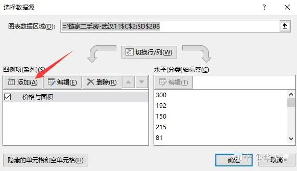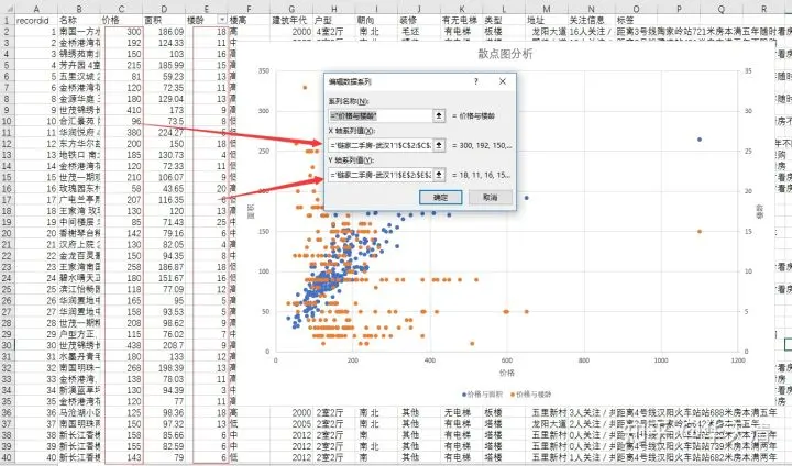在系列名称中输入价格与楼龄,用于分布不同组的数据,然后分别将价格数据C列数据添加到X轴系列值,将楼龄数据E列数据添加了Y轴系列值,并单击确定即可。