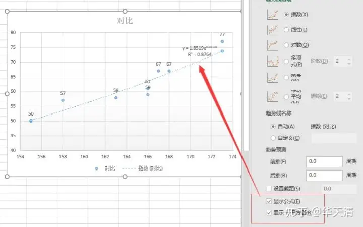 2、可以用来绘制各种函数趋势线,从简单的三角函数、指数函数、对数函数到更复杂的混合型函数,都可以利用它快速准确地绘制出曲线,所以在教学、科学计算中会经常用到。如在Excel散点图中要得到各数据点趋势线的公式、表示趋势线可靠程度的R平方值,只需右键,添加趋势线,然双击选择趋势线,将“显示公式”和“显示R平方值”勾选上,就可得到趋势线的公式,得到趋势线公式是如此的简单。