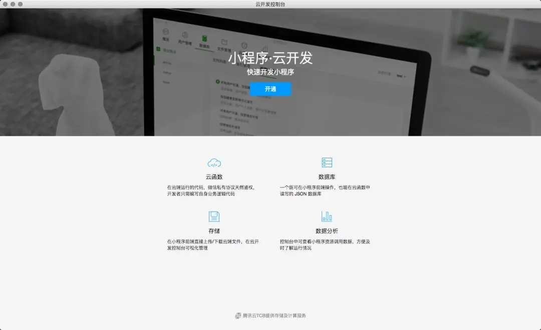 如果是没有开通「小程序·云开发」的账号,首次点击「云开发」会出现下面的界面,该界面主要是「小程序·云开发」的介绍和开通入口。