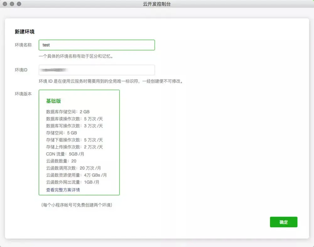 在「新建环境」中,目前暂时只提供基础版套餐。填写上「环境名称」后会自动生成「环境 ID」,点击「确定」后,会使用小程序开发账号在腾讯云开通一个 fake account。到此小程序云就开通了。