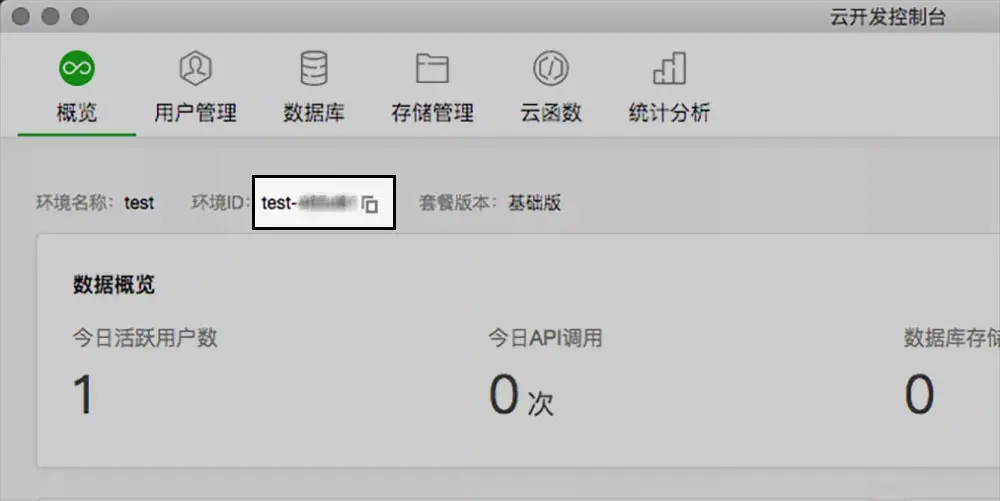 使用上面的代码实现初始化时,需要传入 env 参数,该参数为创建小程序云时的环境 ID,可以在「云开发控制台」中找到: