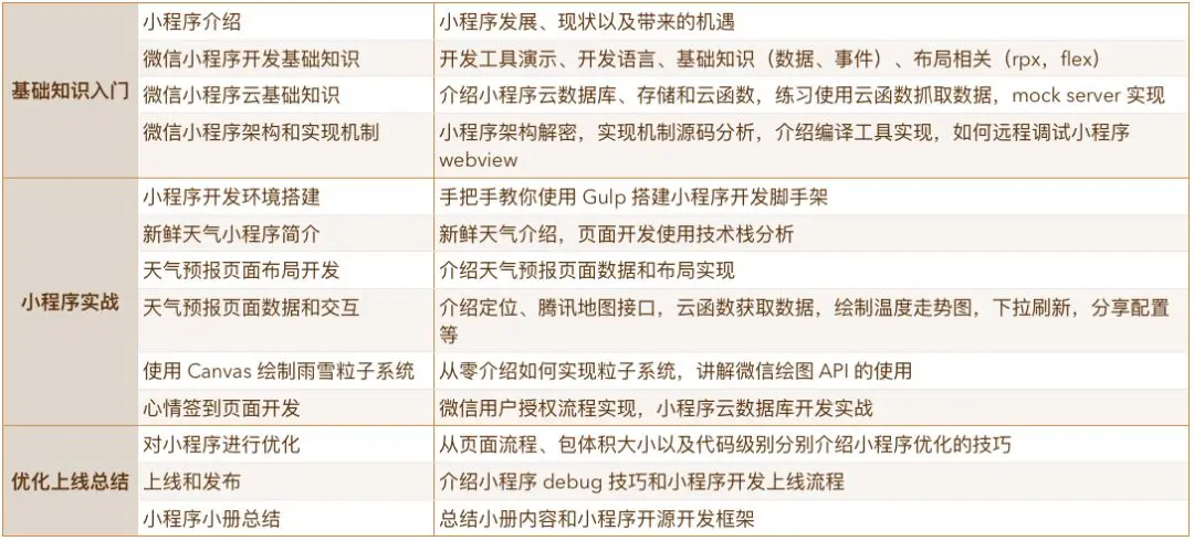 课程内容以打造一款拥有天气预报和签到功能的小程序为主线,从基础知识到小程序运行机制,从开发环境搭建到「小程序·云开发」的接口使用、调试、上线,打通微信小程序开发全流程。