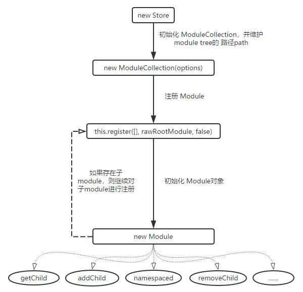开始初始化的时候,符合path.length === 0,所以执行 this.root = newMudle,接着遇到了 if (rawModule.modules)这个判断语句,前面说了 rawModule是传入的 options,所以这里的 rawModule.modules就是类似下面示例代码 ExampleA中的modules