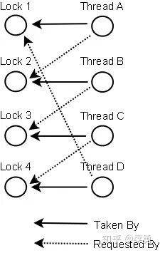 当然,死锁一般要比两个线程互相持有对方的锁这种情况要复杂的多。线程A等待线程B,线程B等待线程C,线程C等待线程D,线程D又在等待线程A。线程A为了检测死锁,它需要递进地检测所有被B请求的锁。从线程B所请求的锁开始,线程A找到了线程C,然后又找到了线程D,发现线程D请求的锁被线程A自己持有着。这是它就知道发生了死锁。