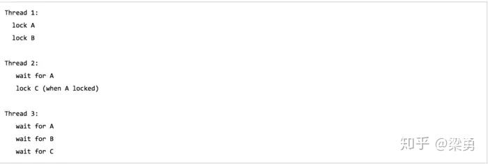 如果一个线程(比如线程3)需要一些锁,那么它必须按照确定的顺序获取锁。它只有获得了从顺序上排在前面的锁之后,才能获取后面的锁。例如,线程2和线程3只有在获取了锁A之后才能尝试获取锁C(译者注:获取锁A是获取锁C的必要条件)。因为线程1已经拥有了锁A,所以线程2和3需要一直等到锁A被释放。然后在它们尝试对B或C加锁之前,必须成功地对A加了锁。