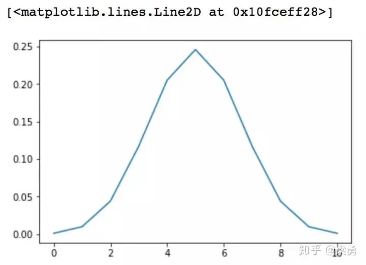 pylab.plot(x,pmf)注意,此图说明抛10次硬币5次头像朝上的几率为25%。