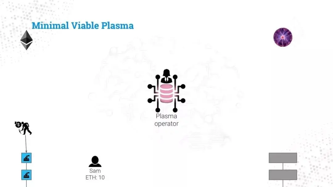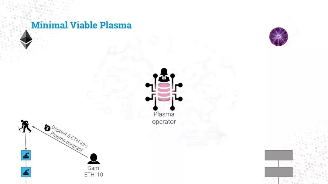 (1) 用户Sam在根链中发送一个交易,该交易声明Sam要将5个ETH存入Plasma合约;
