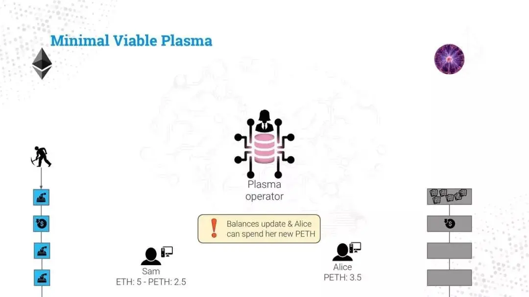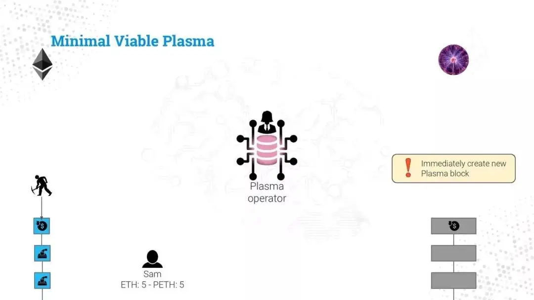 (3) 然后在Plasma链中会创建一个新的区块,该区块包含一笔交易,证明Sam拥有5个PETH。此时,Sam的资金变为5个ETH和5个PETH;