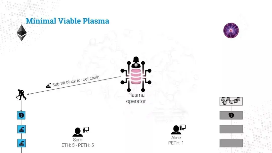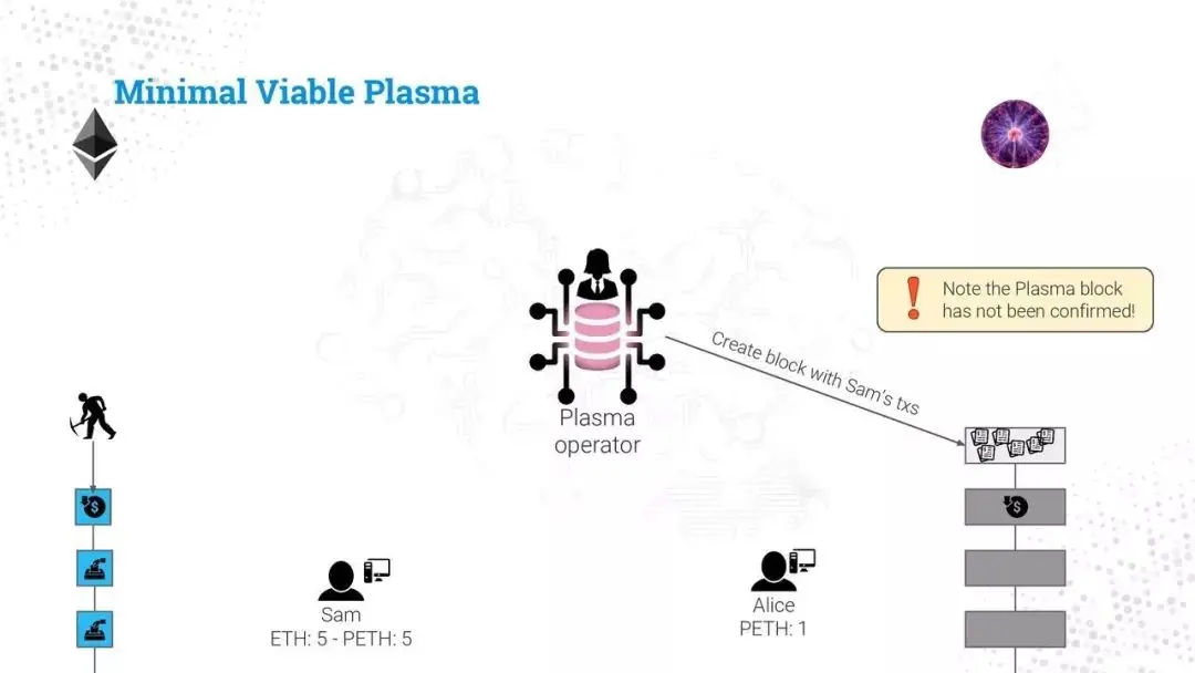 (2) Plasma运营者创建一个区块,该区块将Sam的交易包含在内。此时,该Plasma区块还未被确认,Alice也还不能花费Sam发送给她的PETH;