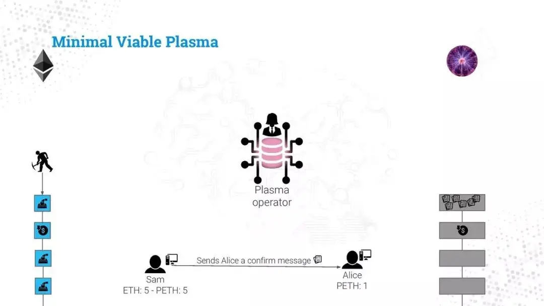 (1) Sam在Plasma链中发出一个交易,声明Sam将2.5个PETH发送给Alice;