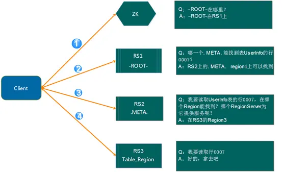 第2步:client请求-ROOT-所在的RS地址,获取.META.表的地址,client会将-ROOT-的相关信息cache下来,以便下一次快速访问