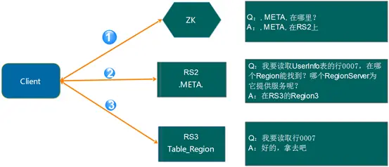 第1步:Client请求ZK获取.META.所在的RegionServer的地址。
