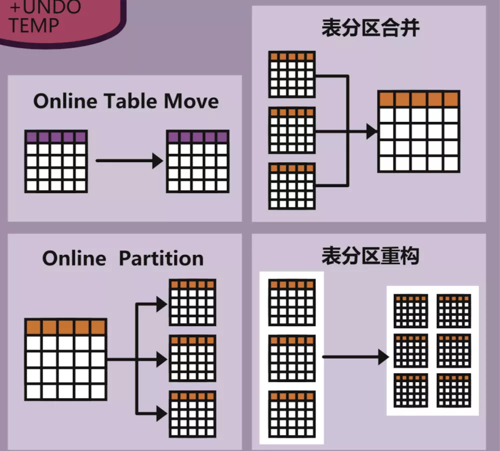如果你的表分区太多不方便,而数据又不太频繁地更新,可以将分区合并为更大的分区,简化管理。这在数据库的以前版本中也可以做到,但是不能联机操作,合并的同时数据无法访问。在Oracle数据库18c中,你可以在线合并分区并维护索引。这个版本里,对表的所有在线操作都齐全了,功能算是完整了。