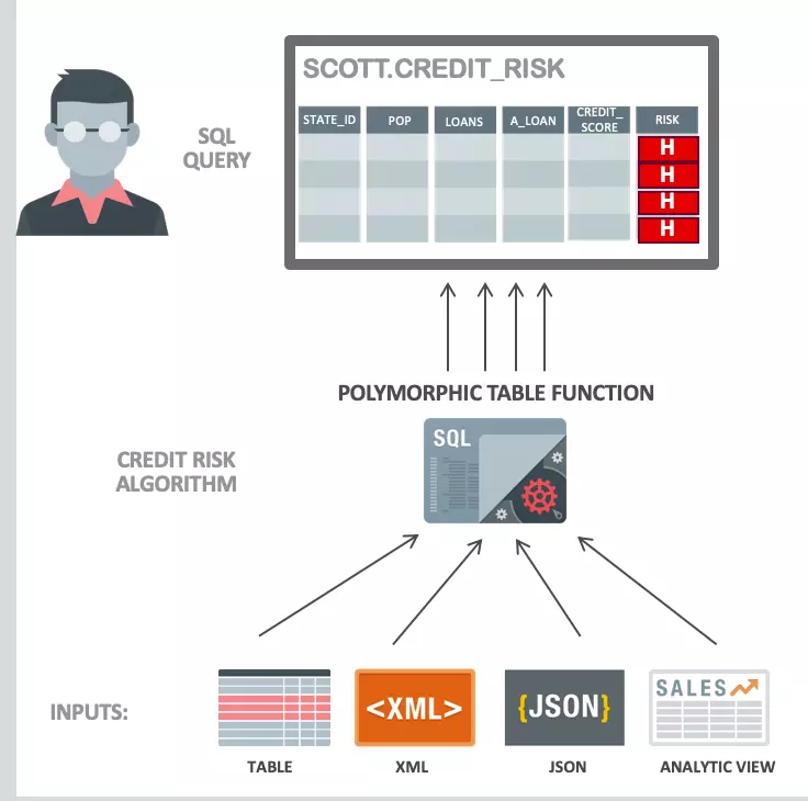 在多态表中封装了更复杂的算法,从而实现隐藏算法,能够利用强大的,动态SQL功能,通过任何表格式进行处理,最终返回SQL行集 (表,JSON, XML doc等)