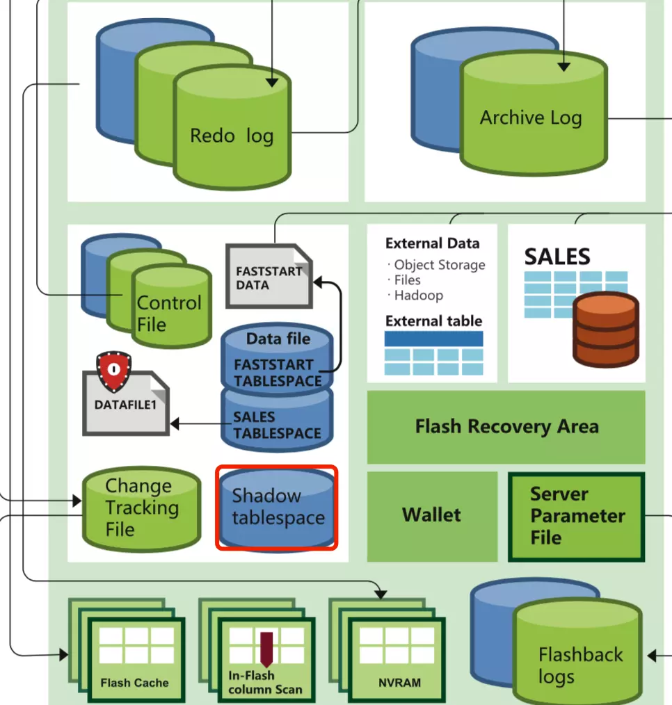 在创建表空间之后,需要使用alter Database/alter pluggable database 语句为数据库开启或者禁用shadow tablespace。