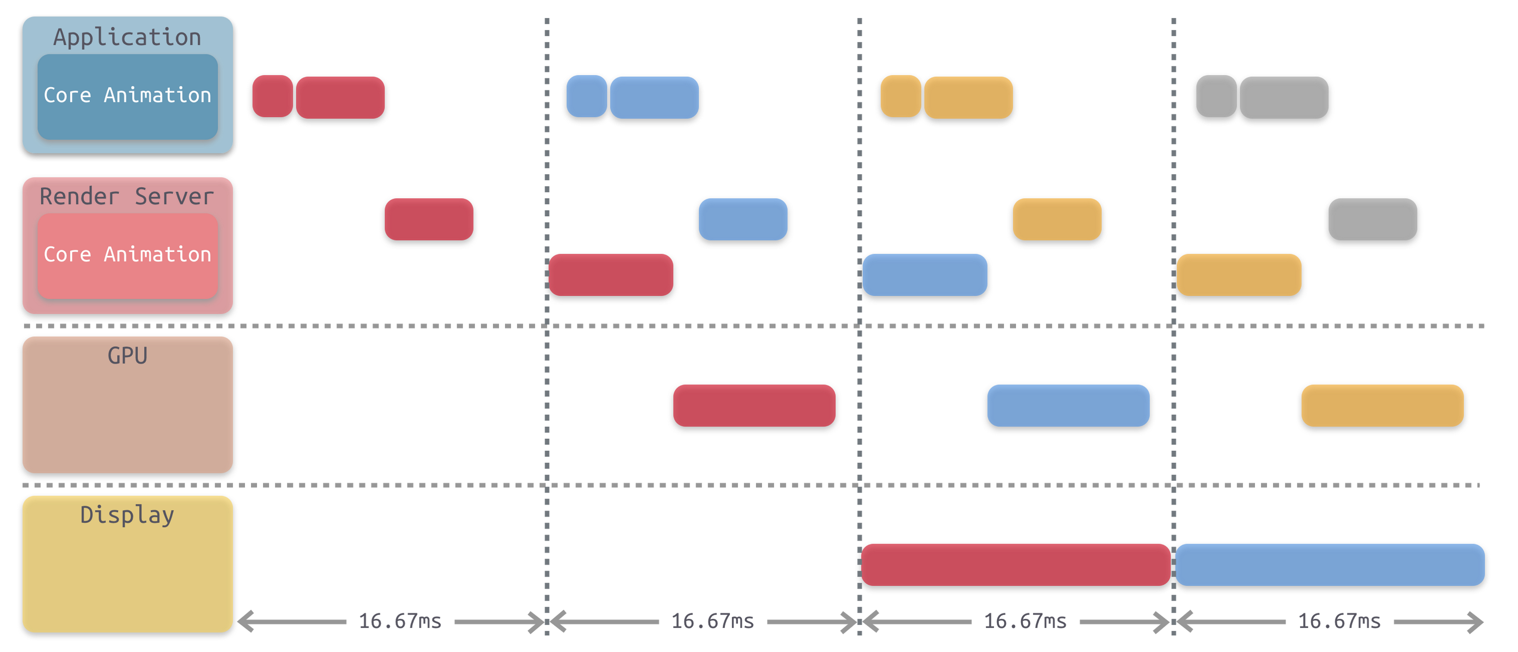 对上述步骤进行串联,他们执行所消耗的时间圆圆超过16.67ms,因此为了满足对屏幕的60FPS刷新率的支持,需要将这些步骤进行分解,通过流水线的方式并行执行,如下图: