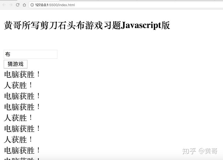 <h3>黄哥所写剪刀石头布游戏习题Javascript版</h3>