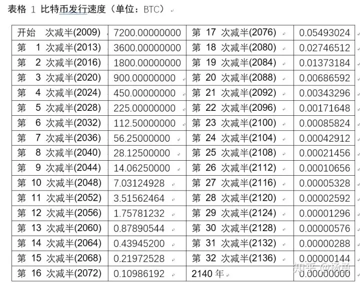 就像我们生存的宇宙被各种基本常数所左右一样[1],在比特币宇宙也有一些基本的常数,比如总的比特币数被设定为2100万个,每10分钟左右[2]可以生成一个比特币区块,从而矿工们可以获得一定量的比特币作为奖励—最初这个值是50个比特币(BTC),每挖出210,000个区块(约4年时间)后奖励减半,直到约2140年,系统不再生成新的比特币[3],所有的比特币都被投入到了流通中。下面这张表[9]说明了比特币的发行速度及衰减情况: