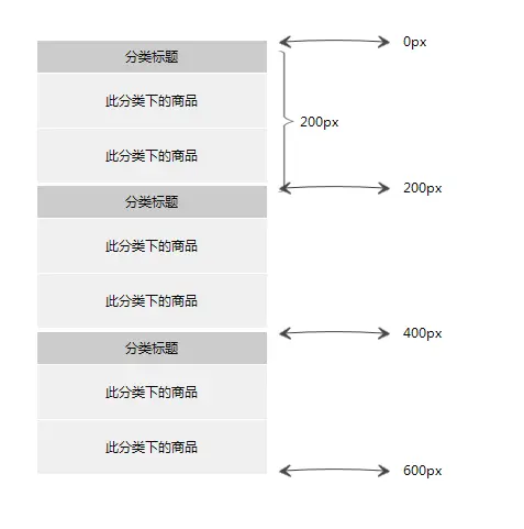 根据上面的草图,假设我们三个分类,每个分类2个产品,得到的高度数组就是[0,200,400,600]