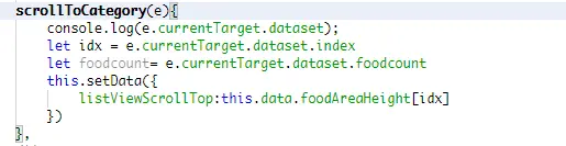下面是点击左侧菜单标签的时候,根据当点前击的标签的索引值,带到区间高度数组,赋值到data中的listViewScrollTop值,并且在滚动容器中scroll-top参数,绑定到这个值,就会滚动到对应的高度
