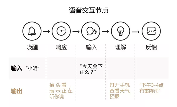 语音交互的过程,和我们平时与人交流的方式非常相似。比如某天中午你正坐在办公室看到窗外阴天,你担心接下来会不会下雨,于是你向正在低头办公的同事喊了一声“小明”,小明听到了抬头看你表示在听,你接着问“今天会下雨么?”小明打开手机查了一下今天的天气预报,然后回答你说“天气预报说下午3-4点有雷阵雨”。