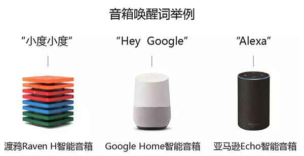还记得我们刚刚提到的“问天气”的例子吗?我们通过呼喊“小明”的名字,来引起他的注意,而对于智能语音交互产品,我们也需要通过叫出“名字”,也就是唤醒词来激活设备。以智能音箱产品为例,“小度小度”是唤醒渡鸦Raven H的唤醒词,“Hey Google”是唤醒Google Home的唤醒词,“Alexa”是唤醒Echo的唤醒词。