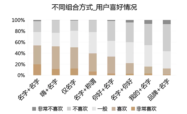 1)在以“名字”为基础的不同组合方式中,“名字+名字”的叠词式组合方式最受用户喜欢,而“品牌+名字”的组合方式最不被用户喜欢。