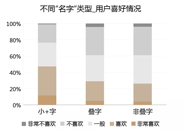 · 在以“名字”为基础的不同组合方式中,“名字+名字”的叠词式组合方式最受用户喜欢,而“品牌+名字”的组合方式最不被用户喜欢;
