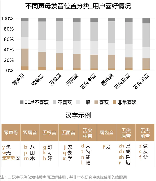 · 声母:用户更加喜欢尾音声母为零声母,而包含了z、c、s的舌尖前音最不被用户所喜欢;